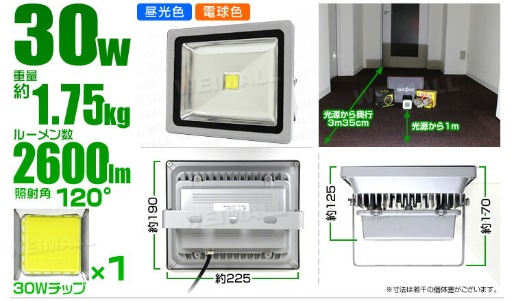 ライトの上下多角度を調整出来るようになっていますので、とても便利です! 商 品 詳 細 内容 本体×2 サイズ (約)225mm×190mm×125mm 重量 (約)1.75kg ルーメン (約)2600LM 照射角 120° LED発光色 昼光色(6000K)、電球色(3000K) 入力電圧 85〜265V 防水規格 IP65 材質 本体:アルミ合金 照射面:強化ガラス コードの長さ (約)3.0m(プラグ付・スイッチ無) 保証期間 1年間 ※使用開始時期や使用期間に関わらず、お買い上げ日から1年間です。