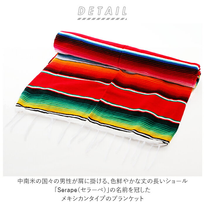ITEM DETAILSブランド名ノーブランド NO BRAND商品名Medium Saltillo or Serape商品説明・中南米の国々の男性が肩に掛ける、色鮮やかな丈の長いショール「Serape(セラーぺ)」の名前を冠した、メキシカンタイプのブランケット。